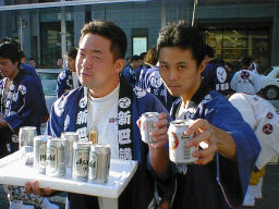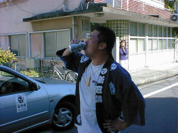 町内をねっている時もビールを忘れないD氏。 (後の女性もウットリ) |
