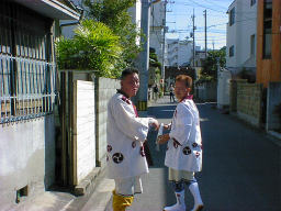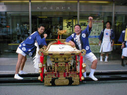某電気ビル前で神輿に乗せてもらいはしゃぐD氏。 *悩みはまずない!脳みそスポンジ状態で全開 |