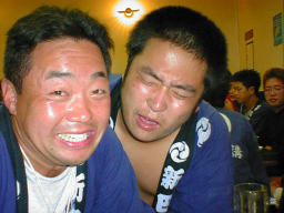 打ち上げにて、松大3回生とのツーショット。 仮に「でぶちょ2号」とでもしておこう。 2号はこの画像の前に焼酎1本をストレートでラッパ飲みにし、D氏によりとどめを刺されて、この後あえなくダウン!トイレに連れて行こうと抱き起こすと、パンツの中から無数の氷が・・・ 祭り自体では救急車を呼ばなかったのに白木屋から市民病院に搬送となりました。(点滴3本の刑) *本日1番のショット!酔っ払いの鏡のようなお二人 |