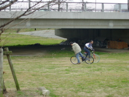 これもちょっと遅すぎ。 ところで彼のマシンは、某PCショップのくじ引きであたったものらしい。 折りたたみのMTB。 しかしタイヤはほとんど空気が入ってない。 さぞかしカロリーを消費したことだろう。 |