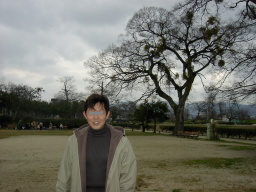 なんだか薄気味悪い背景で記念撮影してしまったE氏。 膝が笑い、足はがくがく。 |