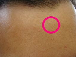 | へっどうえい効果が! 頭皮から垂れたミノキシジルの効果が、額で? 本人が「ここに毛が生えた〜!」と言い張るので。 デジカメ200万画素では捕らえきれません(ToT) |