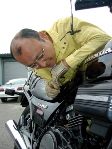 | パンク修理を待つ間に、本日の山伏画像。 ところどころにコーディネイトされた緑のボルトについて、 薀蓄を語る。 |