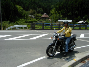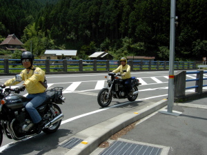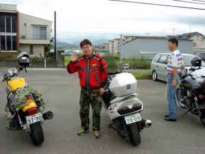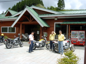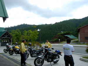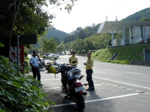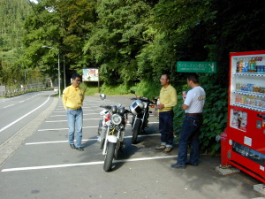 | さらにガス欠寸前のせいばー号。 山間のせこ道にGSなど無い! 早く帰りたいがアクセルオープン不可。 残り30分。 不運が重なり怒りの矛先は、いい加減な道先案内の先頭二人に。 |