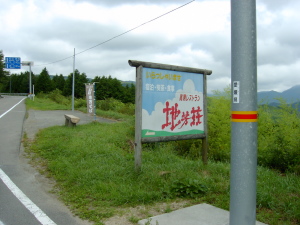 | 砂利と凸凹なせこ道を吐きそうになりながら登ると、 そこは地芳峠。 ホラー映画のタイトルに使えそうな怖ろしげな字体の看板を発見 |