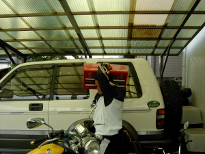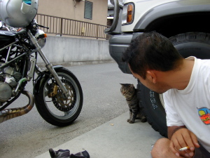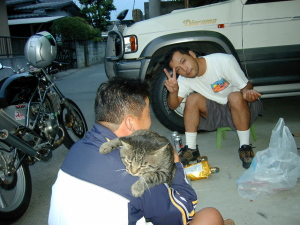 | そのままガレージミーティングに突入。 いつの間にやら、てぽどんも仲間入り。 類を超えておっさん同士には通じるものがあるらしい。 この後、現場へご出勤するも・・ |
