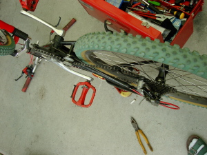 | チェーンカッターでコマを二つ分切ってまた繋いだ。 変速機付きは、少しくらいチェーンが短くなっても問題なし。 |
