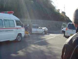 | その先で見たものは、事故現場。 車同士の正面衝突らしい。 救急車も到着、怪我人を搬入中でした。 しかしいつまでたってもパトカーは現れませんでした。 |