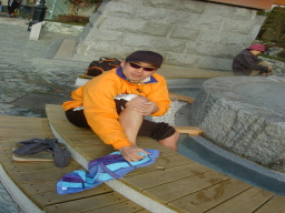 | さっそく後ろ足を湯につけるD。 後ろのギャラリーは、名物からくり時計の見物客です。 |