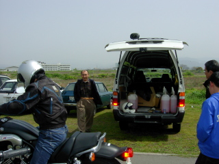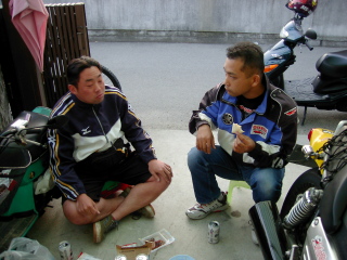 | 夕方、へとへとになって帰宅。そのままガレージミーティングへ突入。 愛車SDRを焼きつかせて傷心のMさんに見せかけだけの同情をするD。 |