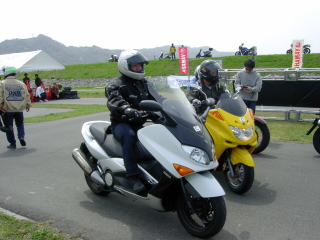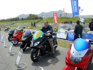 | TMAXがえらくお気に入りのせいばーおやぢ。 この後、フル装備で試乗の順番待ちをするも午前の部が終了。 あと1歩で乗れませんでした。 |