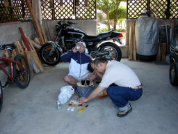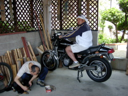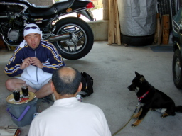 | 夜勤明けのせいばーおやぢ邸を襲撃。 ガレージミーティング重信版 困り果てながらも、煙草を差し出されてにやけるおやぢ。 |