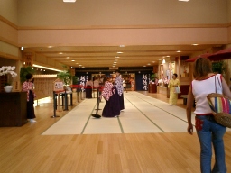 まずは浴衣(雷電為江門やら各種の浴衣を選べる)に着替えて。 館内は、江戸時代の湯屋を現代風に再現?したらしい。 「千と千尋の神隠し」の舞台となったあの湯屋のイメージに近い |