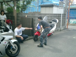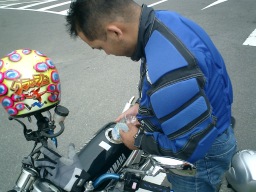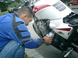 乳搾り? 石鎚スカイライン頂上でガス欠 CBのキャブからガソリンを頂戴するMさん。 手馴れたものです |
