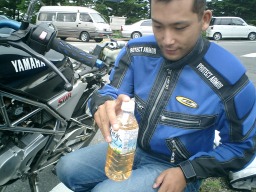 賞味期限切れの某メーカー在庫処分ドリンクを持って帰る M&Jr2号 |