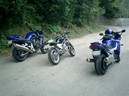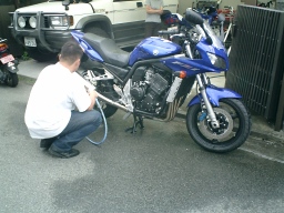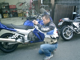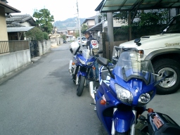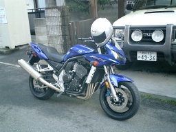 愛媛初お目見え(多分)YAMAHA FZ1(USA) 欧州向けのFZS1000と基本的に同じ。 サイドにリフレクターがあるのがUSA仕様の証。 USAではパッシングスイッチも必要ないらしい。 あいにくの曇り空だが、早く慣らしをすませたいDさん。 |