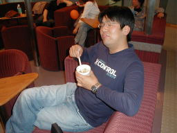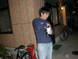 | フロンテの天井に腰掛けんばかりに、カップラーメンをすする。 | |