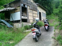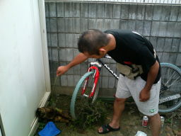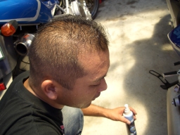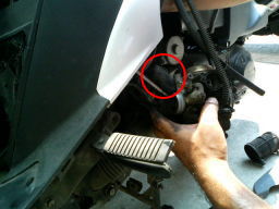 サイドカバーをはずして、キャブを無理やり引っ張り出して強行。 Mさん、くそ暑い中、大汗で格闘していただきました。 |