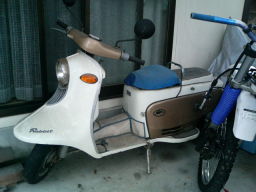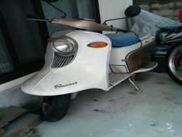 | いまどきのスクーターと違い外装も鉄! 通常なら腐食してしまうというサイドスタンドもまだまだ大丈夫らしい。 説明する持ち主のM木さんも熱が入るところ。 聞くおっさんも興奮、すでに大量脱毛。 |