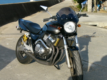 | CB400SF リアサスにオーリンズ 荷重を考えるとこれしかないかも サブフレーム やはり荷重対策か? 男らしいちょっかんマフラー入り さすがにゴッドファーザーのテーマが鳴るホーンはついてないだろうと・・・ |