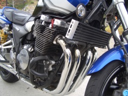 人の庭先でたちしょん直後のワイルドなわたぞう氏 TRXと比べると、さすがにでかいXJR1300 ヤマハの誇る空冷4発、本物のフィンが男らしい。 |