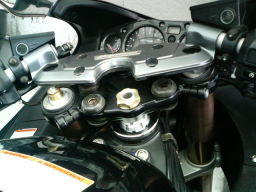 隼のハンドルはトップブリッジと一体型。 固化した4本のボルトを必死ではずしたところ。 この間にスペーサーを挟みこむ。 |