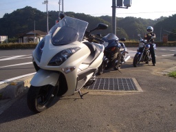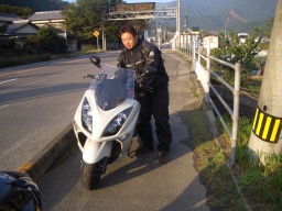 | まずは松山〜桜三里〜丹原へ FZ1から新型マジェスティに乗り換えたD代表。 久しぶりにご参加。 コーナーでセンタースタンドから火花を飛ばしながら走行。 |