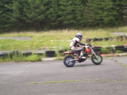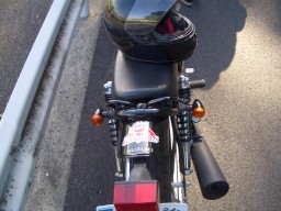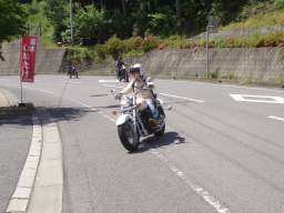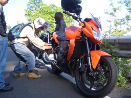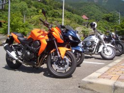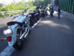 あいかわらず「全ての道はわしのもの」ペースで走行する。 が、今日はやっとライディングに開眼したらしく、 目を輝かせてニーグリップの重要性を語るも 、部下2名に心配そうに見つめられていた。 |