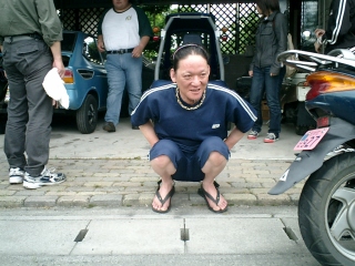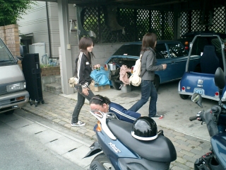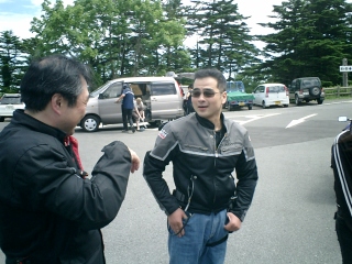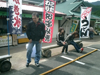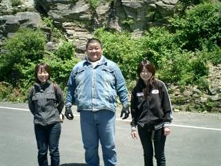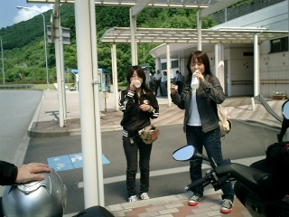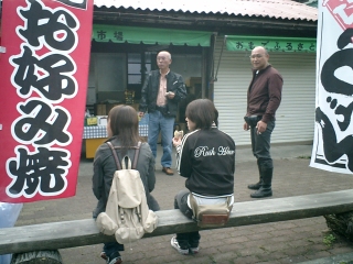 焼きもち1個100円を女子におごり、ご満悦のわたぞう氏。 さすが、しゃちょうっ! ここで、あとから追いかけてきたと思われるカルロスZ750が前を通り過ぎていく。 秘密兵器シスターズが手を振るも全く気がつかず。 |