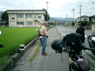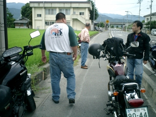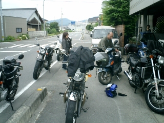 心配するメンバーをよそに、元気ぶりをアピールする忍ちゃん。 ふろんておやぢの面目躍如、工具を引っ張り出し、テープやらバンドで応急処置。 大破したのはライト回りだけで、保安部品もFフォークも無事で走行に問題なさそう。 本人は擦り傷ひとつなく、こけた様子もないので不思議。さすが柔道の猛者? いずれにしても無事で何より。 帰宅してよめはんにばれないよう修理に出すことをお勧めします。 このまま西条で、忍ちゃんとらっきょおやぢと別れ、 松山組は小松から高速に乗って帰ることになった。 が、このあと、さらに |