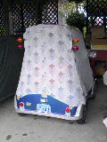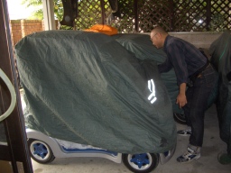 ふっふーん♪ ぴったりぢゃろう! 喜色満面。 昔の軽自動車用のカバーをひっぱり出して ミツオカ号用に作ったらしい。 前後がすぐ確認できるように、反射テープを縫い付けてあるのが 小憎たらしい |