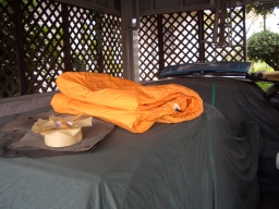 幌の材料は、この黄色いテントを利用するのだと言い張る 大丈夫か・・・ |