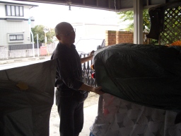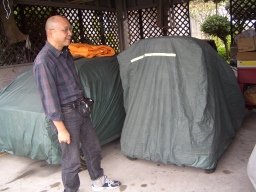 おっさん、いました。 と まあ、みてくれ とミツオカ号にカバーをかけはじめる。 |