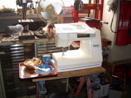 どこから手に入れたのか、ミシンまで用意してある |