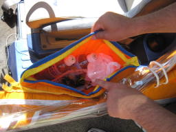 | さらに 左側の扉は、バージョンアップされ 小物入れが設置(もちろんミシンで自作) 中にはジュースと飴ちゃん。 |
