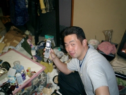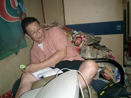 二人が苦労して設置しているのを、 一人アイスを食って焼酎飲んで、他人事のKやろう。 後ろの壁には見たこともない虫が這っている・・・ |