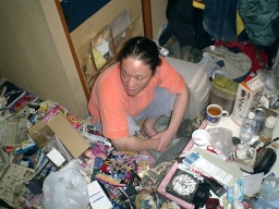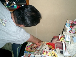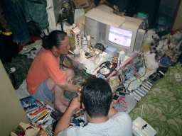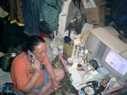 まずは電話回線のコネクタを探すが・・・ 雑誌の山に埋もれてコネクタが見つからない |